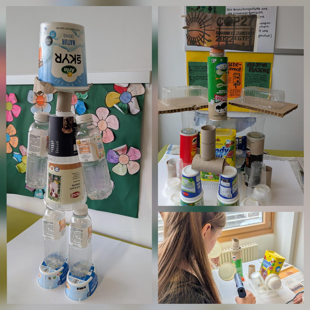 Die Klasse 8a beschäftigte sich mit Upcycling und gestaltete aus Verpackungsmüll Skulpturen.