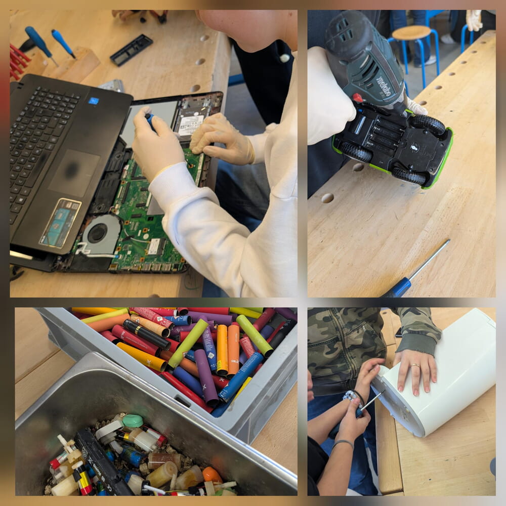 Ein besonderes Highlight in dieser Projektwoche war für alle der Workshop mit Frau Tröbs von der ABG Recycling gGmbH. Hier durften die Schülerinnen und Schüler Elektrogeräte, wie Handys, Laptops, Föhne und auch Wapes auseinanderbauen und erfuhren, wie wertvolle Rohstoffe recycelt werden können.