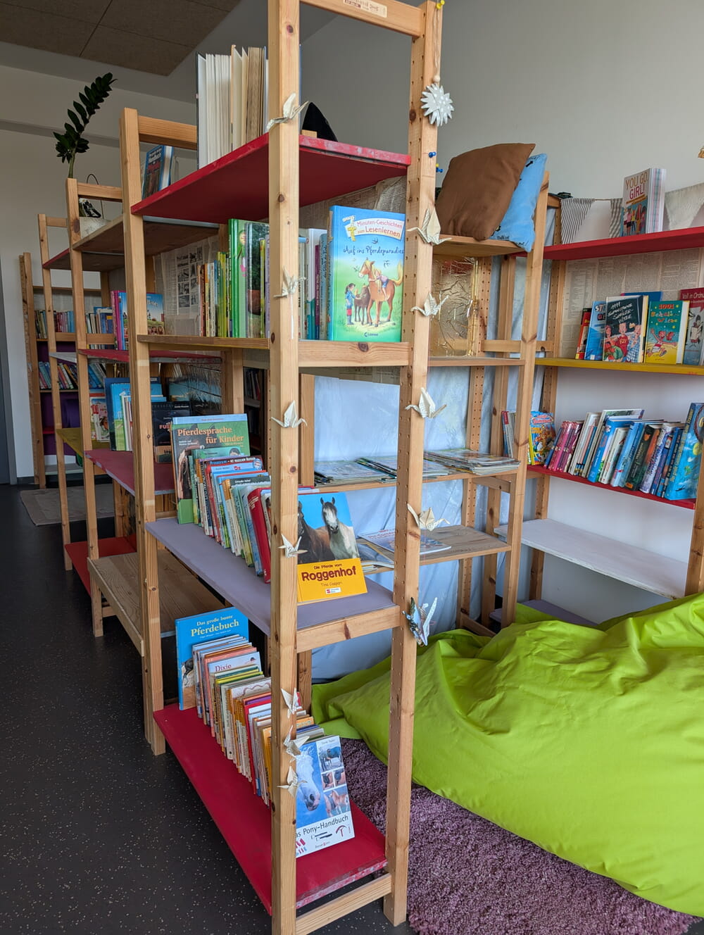 Jetzt lädt die Schülerbibliothek zum gemütlichen Lesen ein: Sitzsäcke, Sofa, Decken, Teppiche und Lichterketten machen zusammen mit Büchern für jeden Geschmack, die Leseecken zu einem perfekten Rückzugsort. Es gibt ein vielfältiges Angebot an Büchern, von spannenden Abenteuern bis hin zu informativen Sachbüchern, sodass hier jeder fündig wird.