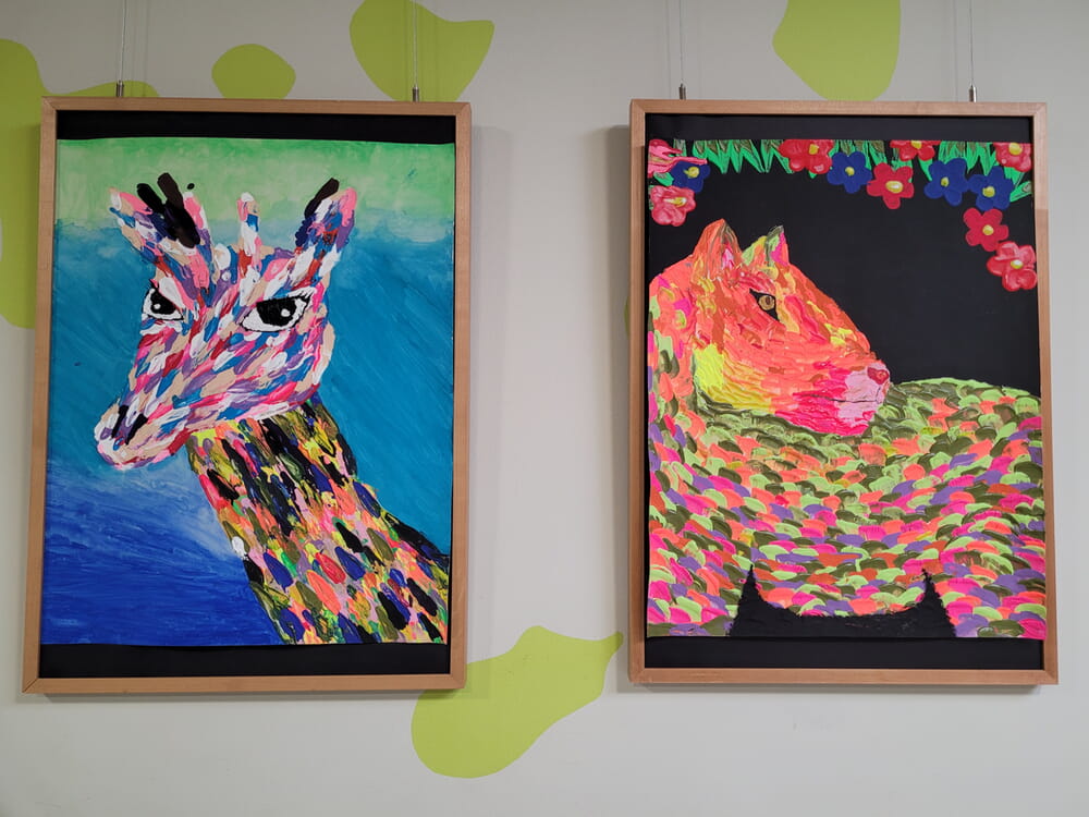 Die Klassen 9 und 10 gestalteten im Kunstunterricht Tierbilder in Spachteltechnik. Dabei trugen sie die Farbe pastos und strukturiert auf.
