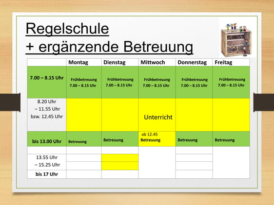 Die Stundenpläne sind exemplarisch für Klasse 1. Alle Klassen werden von Regel- und Ganztagskindern besucht.